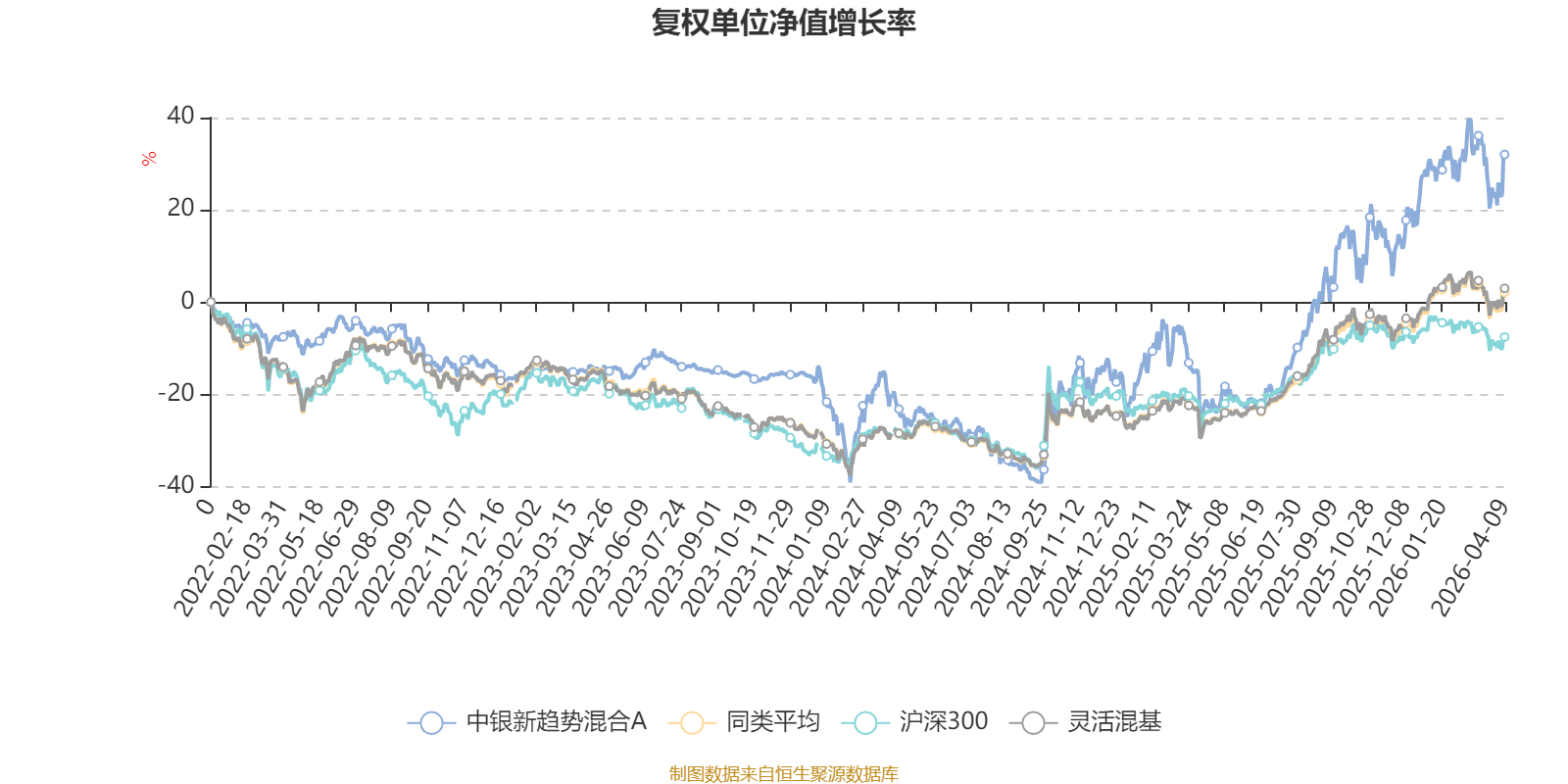 该基金属于灵活配置型基金。截至4月9日,单位净值为2.224元。基金经理是杨成,目前管理的3只基金近一年均为正收益。其中,截至4月9日,中银新趋势混合A近一年复权单位净值增长率最高,达75.12%;中银新经济灵活配置混合A最低,为59.58%。