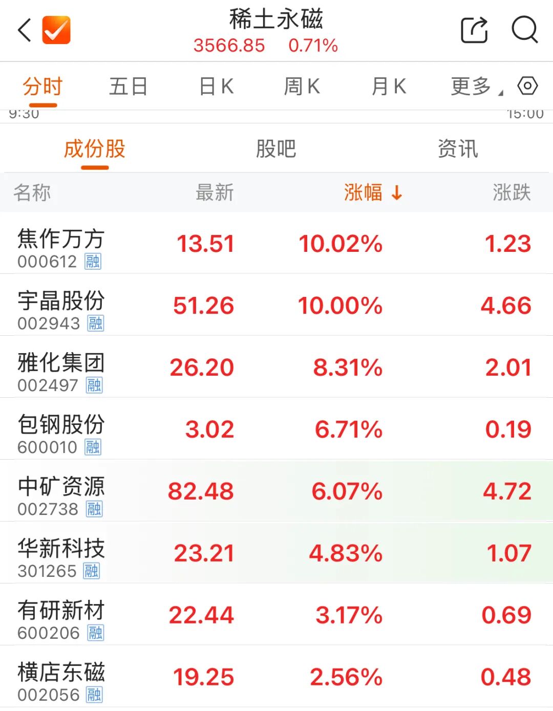 能源金属板块整体表现强势。稀土板块领涨,焦作万方、宇晶股份涨停,雅化集团、包钢股份涨幅居前。