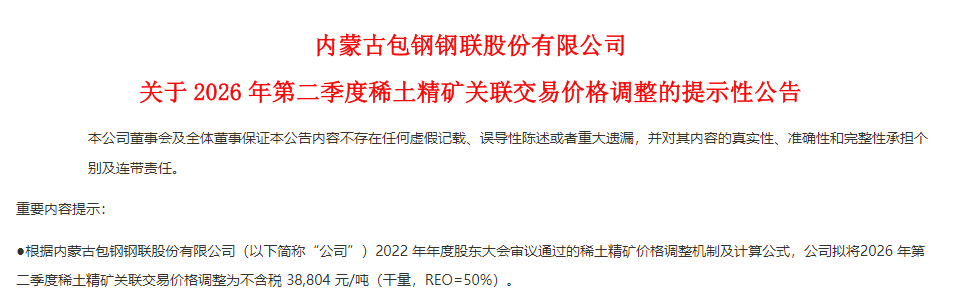 消息面上,包钢股份4月10日盘后公告称,根据稀土精矿价格调整机制及计算公式,公司拟将2026年第二季度稀土精矿关联交易价格调整为不含税38804元/吨(干量,REO=50%)。该价格较今年一季度的26834元/吨,上调幅度44.61%。