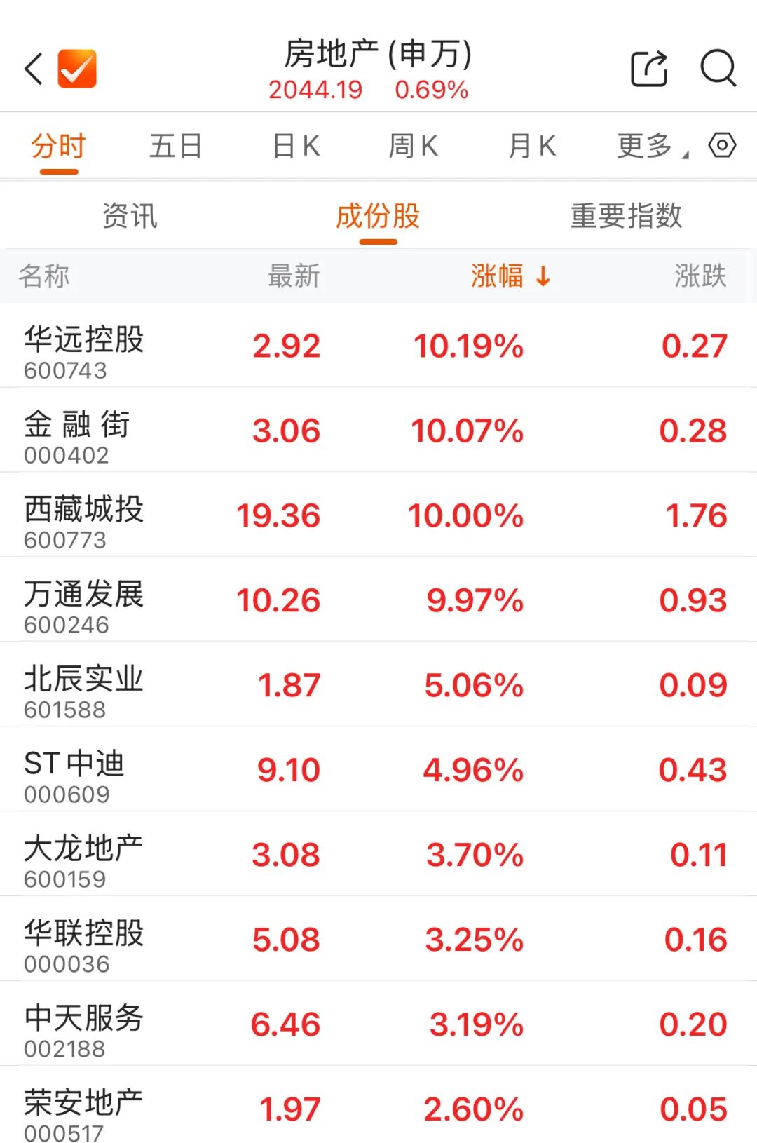 A股房地产板块延续复苏态势。华远控股(600743)涨停,收获日线五连板;金融街收获两连板,西藏城投、万通发展同样涨停。建筑材料板块同步走强,中材科技、中国巨石、宏和科技收获涨停。