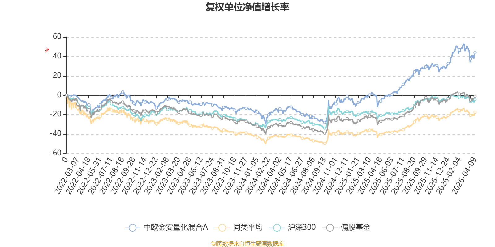 截至4月9日,中欧金安量化混合A近三个月复权单位净值增长率为1.48%,位于同类可比基金211/621;近半年复权单位净值增长率为9.19%,位于同类可比基金108/621;近一年复权单位净值增长率为59.59%,位于同类可比基金132/618;近三年复权单位净值增长率为51.39%,位于同类可比基金62/559。