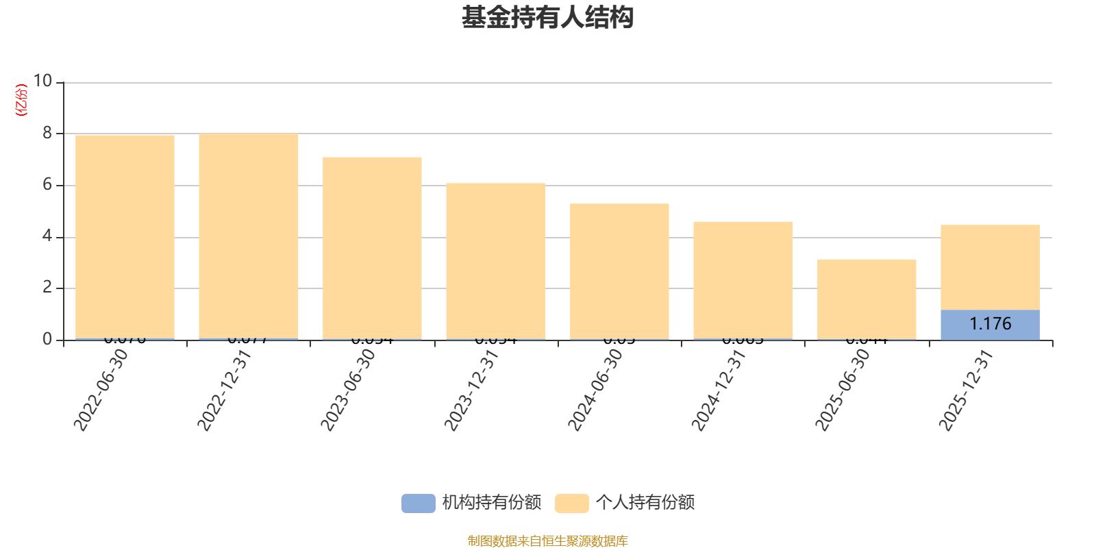 截至2025年12月31日,基金持有人共计3617户,合计持有4.47亿份。其中管理人员工持有17.47万份,占比0.04%,机构持有份额占比26.32%,个人投资者占比73.68%。