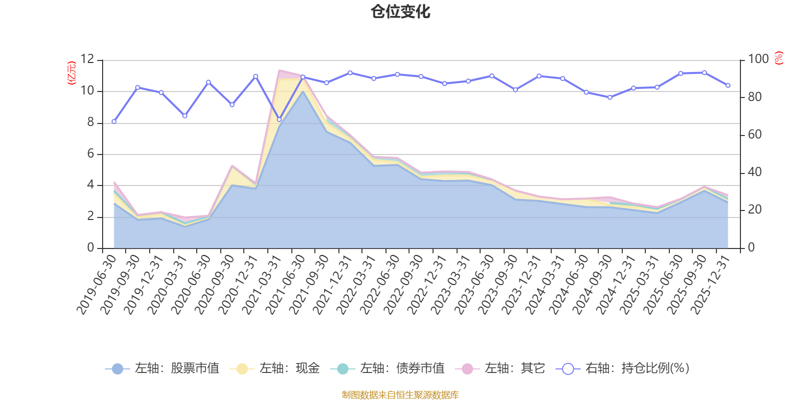 据定期报告数据统计,近三年平均股票仓位为87.71%,同类平均为85.83%。2025年三季度末基金达到93.27%的最高仓位,2019年上半年末最低,为67.31%。