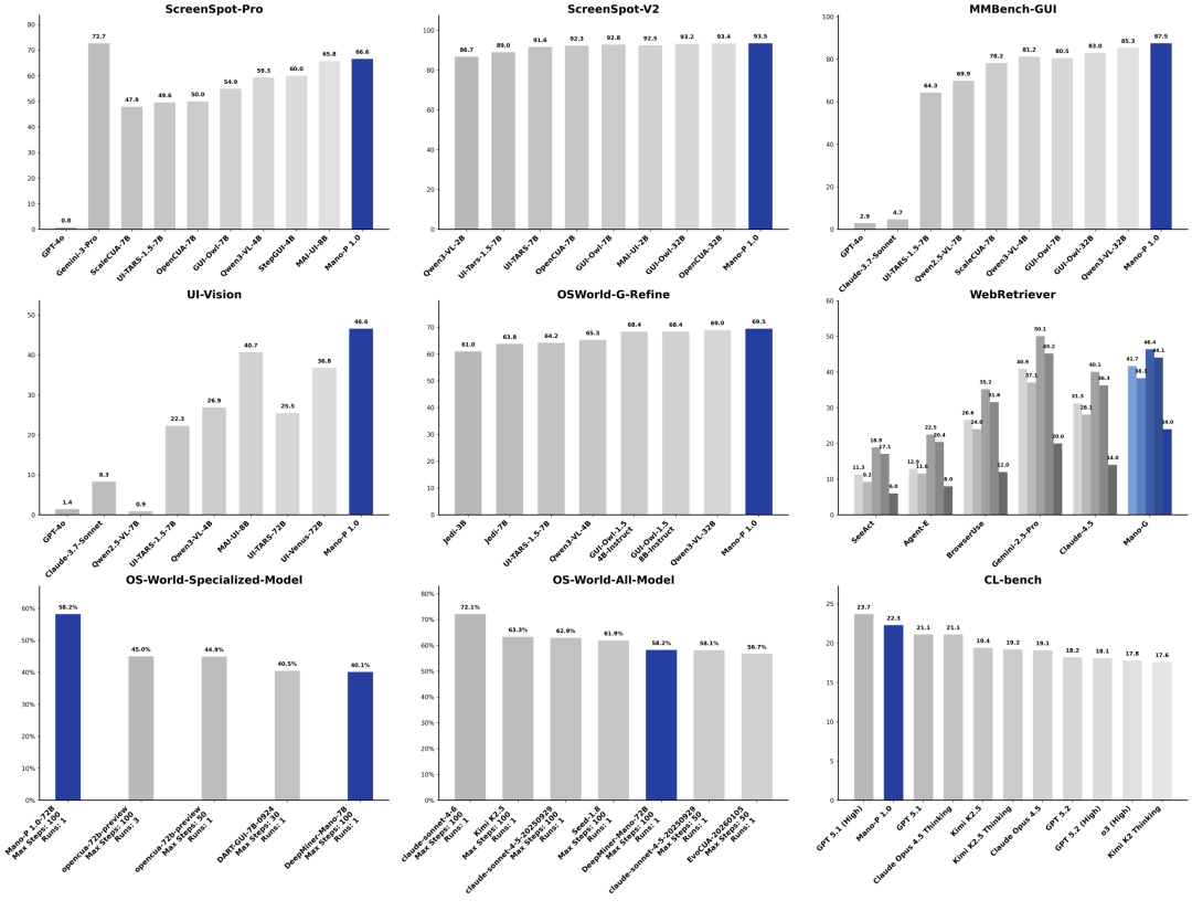 在业界权威的 OSWorld 专有模型基准测试中,Mano-P 72B 模型以 58.2% 的任务成功率位列全球第一,领先第二名 opencua-72b(45.0%)多达 13.2 个百分点 。此外,在 ScreenSpot-V2、MMBench、UI-Vision等评测体系中,Mano-P 同样以绝对优势拔得头筹 。