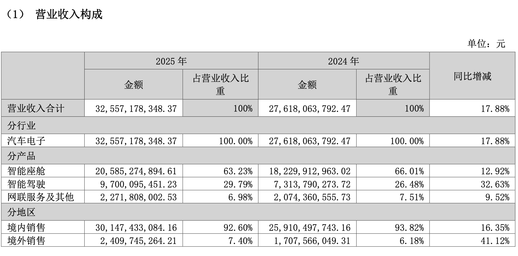 2025年,德赛西威营收325.57亿元,同比增17.88%。其中智能座舱业务全年营收205.85亿元,同比增长12.92%;智能驾驶业务全年营收97亿元,同比增长32.63%。两项业务占整体营收比重分别为63.23%、29.79%。