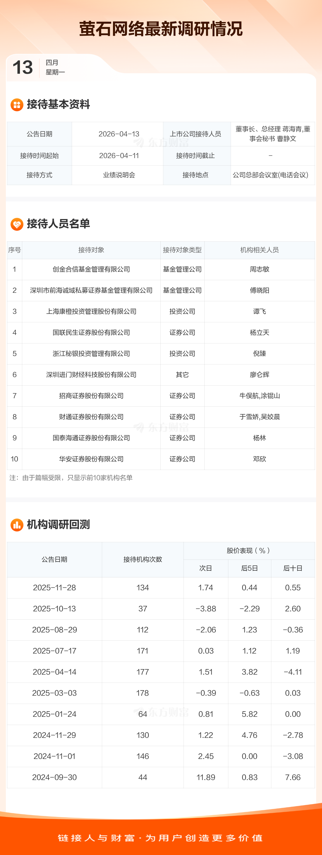 萤石网络4月13日公告称,4月11日接待创金合信基金管理有限公司等113家机构调研。接待人员包括董事长、总经理 蒋海青,董事会秘书 曹静文。