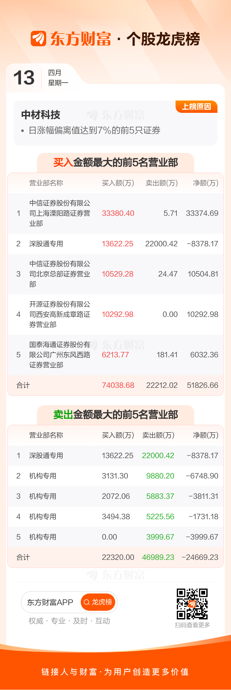 交易所2026年4月13日公布的交易公开信息显示,中材科技因成为日涨幅偏离值达到7%的前5只证券上榜。中材科技当日收报50.14元,涨跌幅10.00%,偏离值9.46%,换手率3.81%,成交额31.13亿。