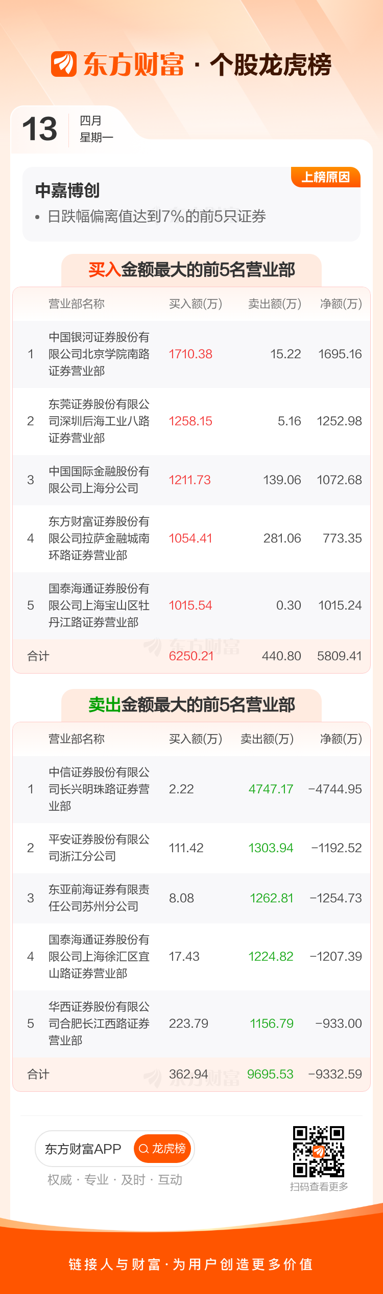 交易所2026年4月13日公布的交易公开信息显示,中嘉博创因成为日跌幅偏离值达到7%的前5只证券上榜。中嘉博创当日收报3.92元,涨跌幅-9.89%,偏离值-10.54%,换手率24.96%,成交额8.74亿。
