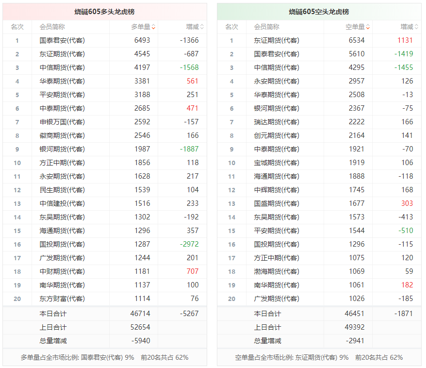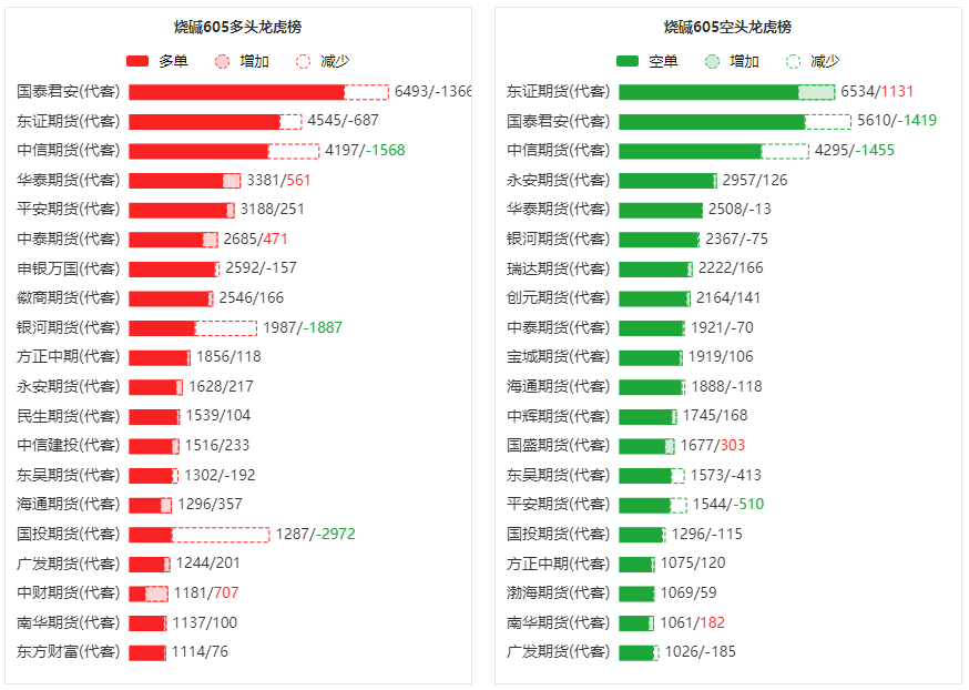 总体而言,烧碱605合约今日减仓下行,多空持仓排名前20席中,多空双方均呈退场态势,多头退场意愿强于空头。