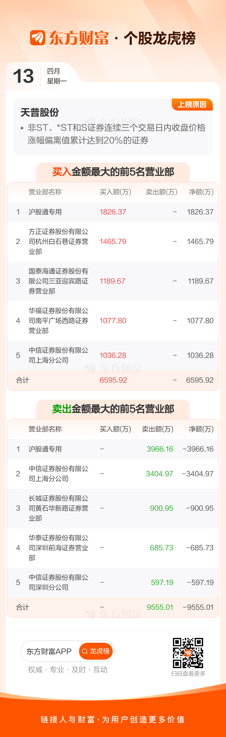 交易所2026年4月13日公布的交易公开信息显示,天普股份因成为非ST、*ST和S证券连续三个交易日内收盘价格涨幅偏离值累计达到20%的证券上榜。天普股份当日收报115.84元,涨跌幅10.00%,换手率3.80%,成交额5.61亿。异常期间4月10日至4月13日,期间涨幅20.99%,累计偏离值20.43%,区间成交额8.10亿。