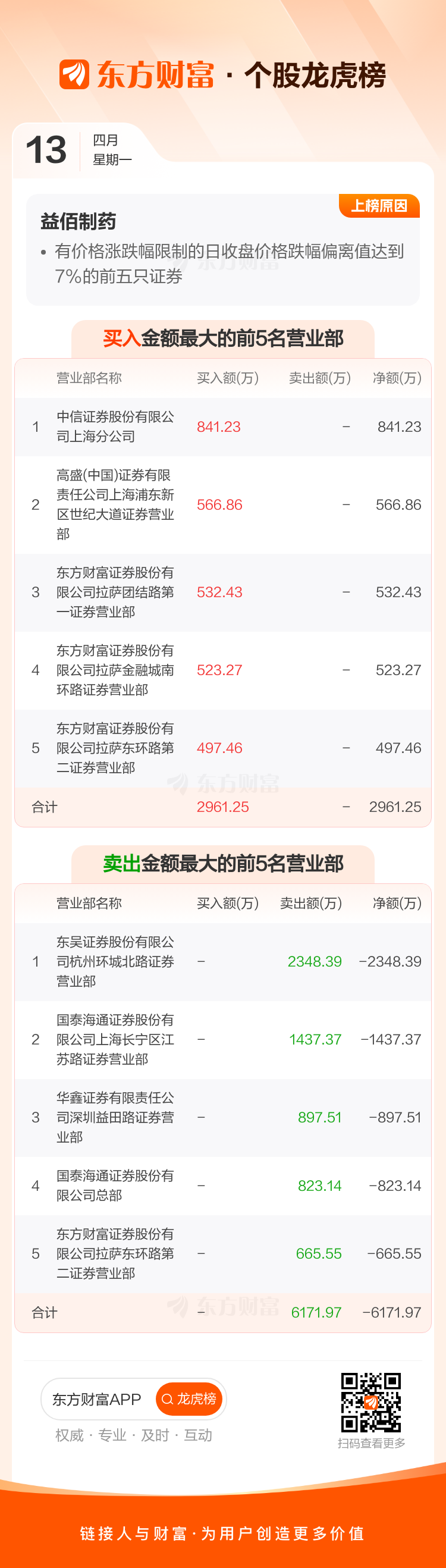 交易所2026年4月13日公布的交易公开信息显示,益佰制药因成为有价格涨跌幅限制的日收盘价格跌幅偏离值达到7%的前五只证券上榜。益佰制药当日收报4.42元,涨跌幅-8.11%,偏离值-8.17%,换手率15.36%,成交额5.44亿。