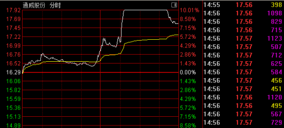 光伏概念午后发力走高,浙江新能涨停,大全能源涨约8%,盘中一度涨超12%;通威股份涨7.86%,盘中一度涨停;晶澳科技、隆基绿能等盘中均冲高。