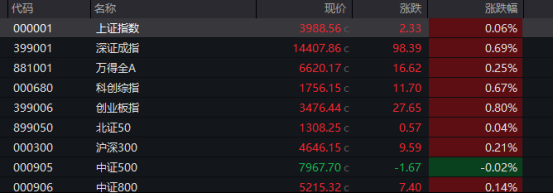 具体来看,沪指盘中在4000点下方窄幅震荡,尾盘翻红;创业板指、科创综指盘中涨超1%。截至收盘,沪指微涨0.06%报3988.56点,深证成指涨0.69%,创业板指涨0.8%,科创综指涨0.67%,沪深北三市合计成交约2.16万亿元,较此前一日减少约1745亿元。