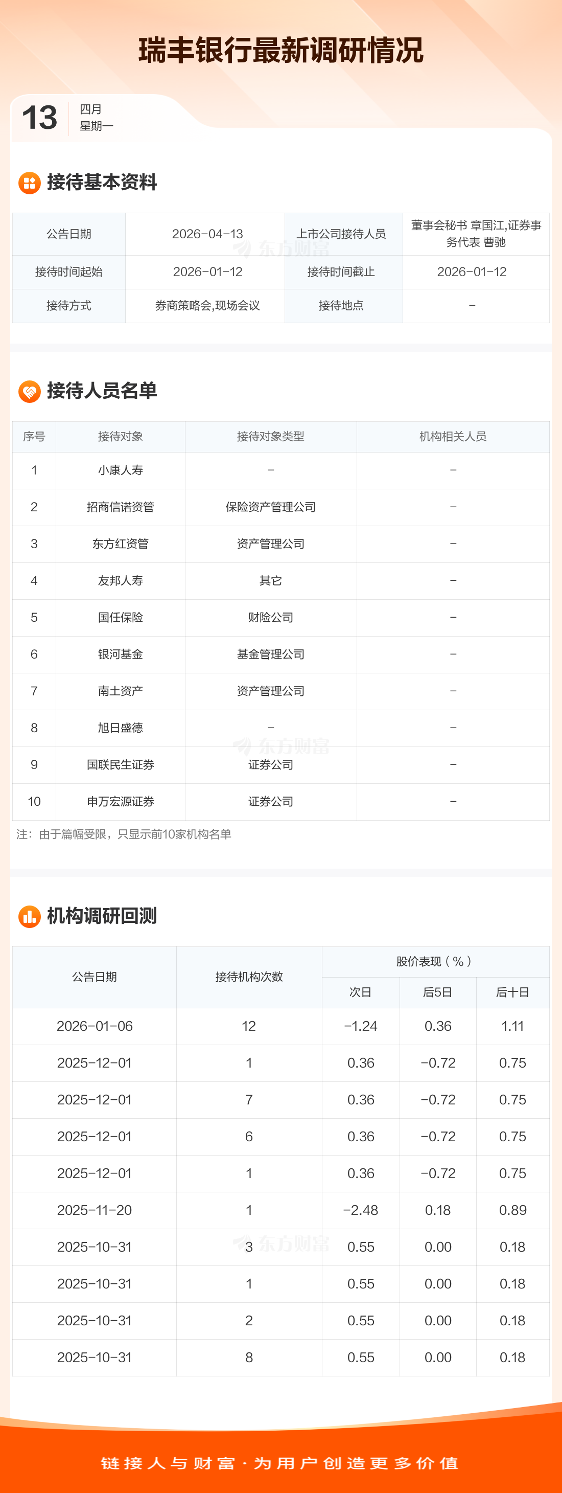 瑞丰银行4月13日公告称,1月12日接待小康人寿等11家机构调研。接待人员包括董事会秘书 章国江,证券事务代表 曹驰。