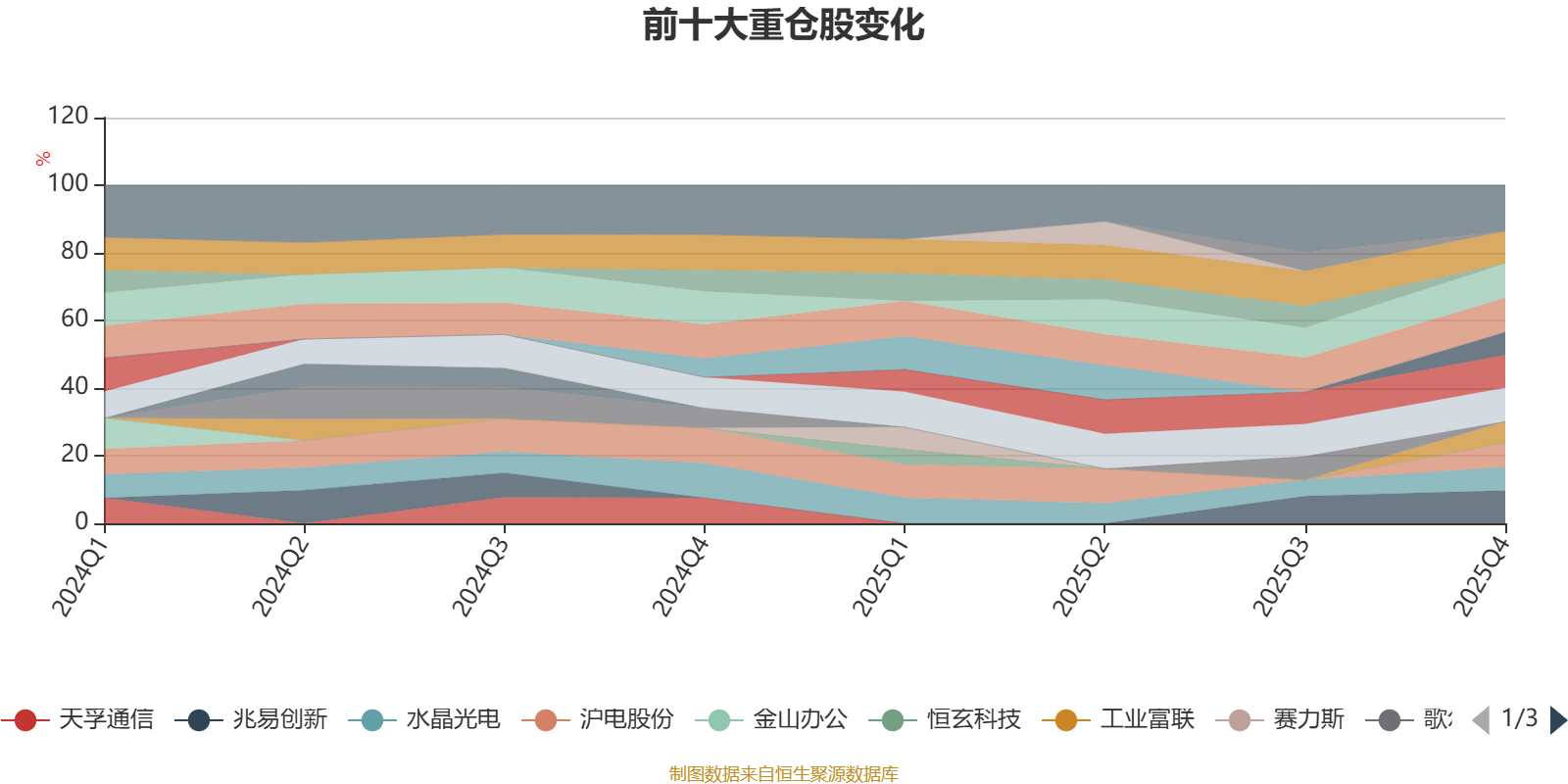 该基金持股集中度较高,近2年前十大重仓股集中度长期超过60%。截至2025年末,基金十大重仓股分别是立讯精密、中际旭创、新易盛、兆易创新、德赛西威、豪威集团、沪电股份、水晶光电、蓝思科技、工业富联。
