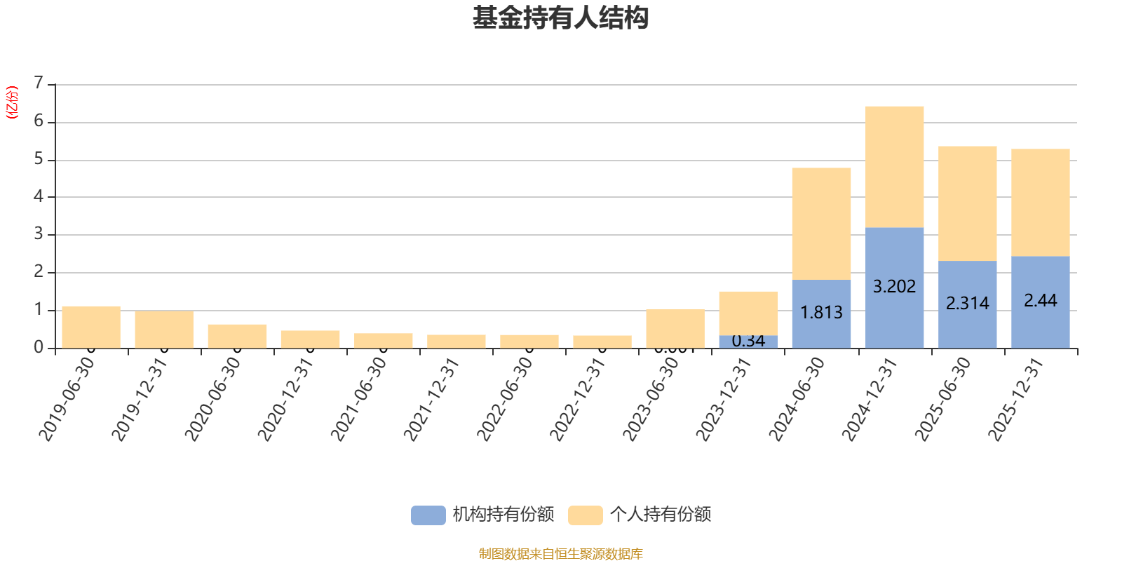 截至2025年12月31日,基金持有人共计8.98万户,合计持有5.28亿份。其中管理人员工持有55.82万份,占比0.11%,机构持有份额占比46.19%,个人投资者占比53.81%。