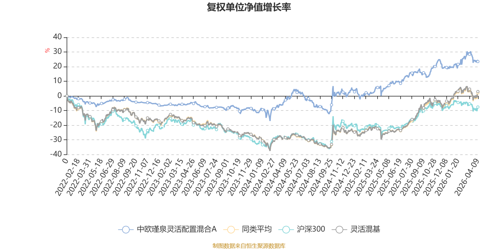 截至4月9日,中欧瑾泉灵活配置混合A近三个月复权单位净值增长率为1.67%,位于同类可比基金360/1287;近半年复权单位净值增长率为7.37%,位于同类可比基金313/1286;近一年复权单位净值增长率为20.16%,位于同类可比基金857/1286;近三年复权单位净值增长率为30.67%,位于同类可比基金338/1286。