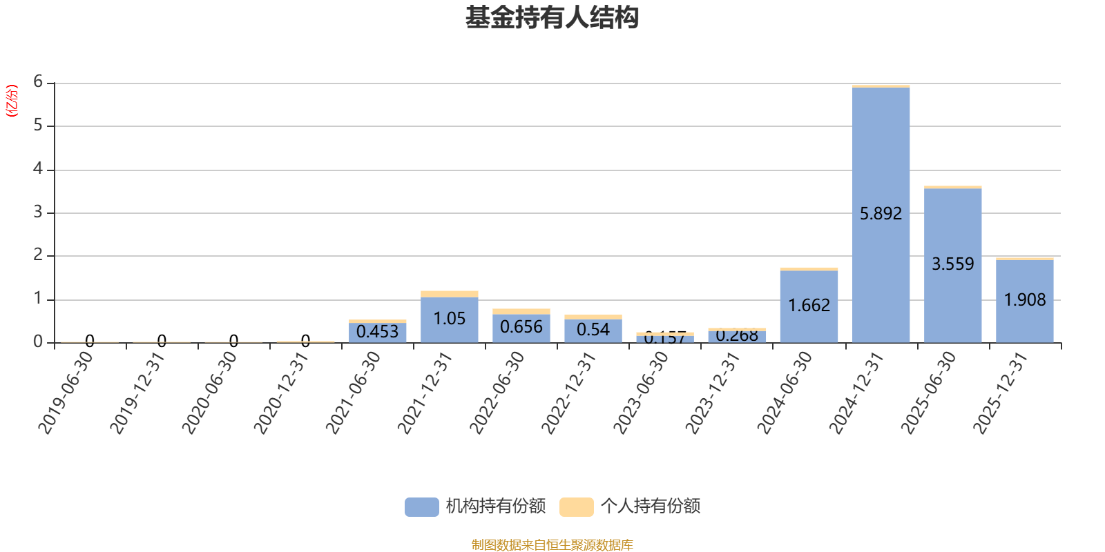 截至2025年12月31日,基金持有人共计998户,合计持有1.96亿份。其中管理人员工持有3.56万份,占比0.02%,机构持有份额占比97.40%,个人投资者占比2.60%。