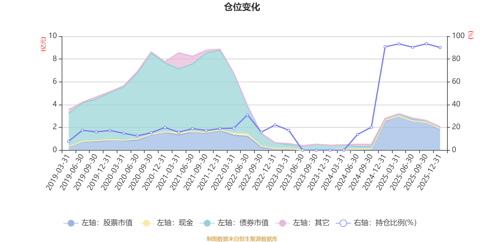 据定期报告数据统计,近三年平均股票仓位为42.48%,同类平均为72.57%。2025年三季度末基金达到93.45%的最高仓位,2019年一季度末最低,为7.83%。