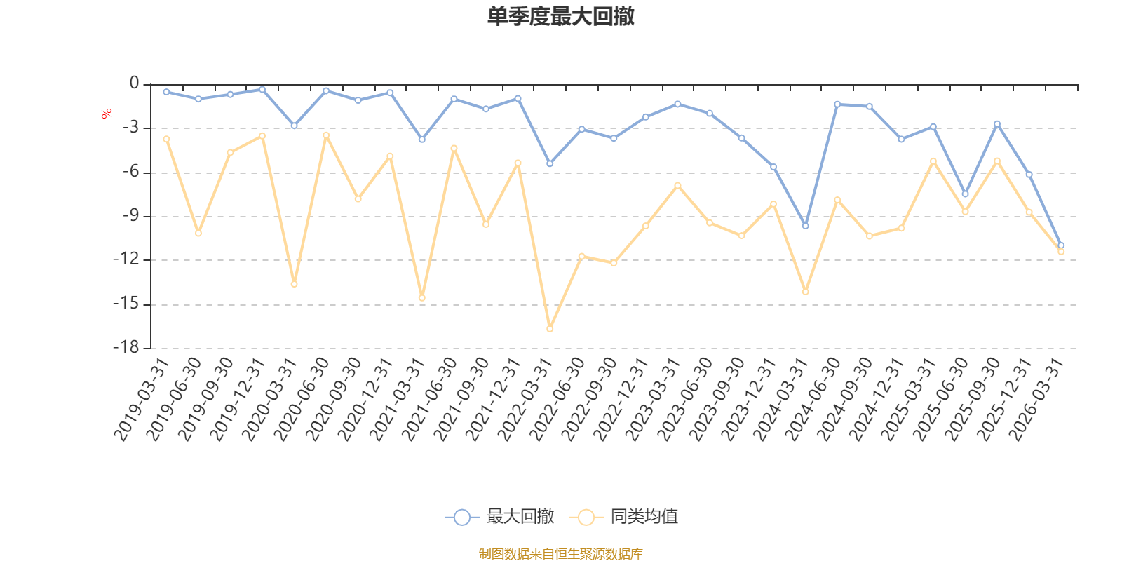 截至4月9日,基金近三年最大回撤为14.99%,同类可比基金排名190/1264。单季度最大回撤出现在2026年一季度,为10.99%。