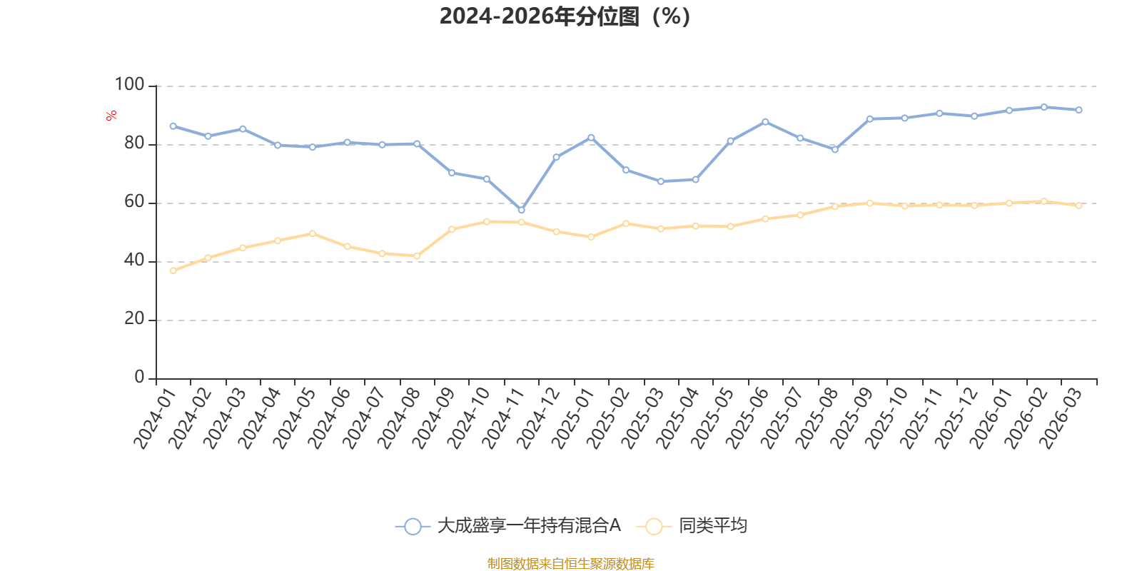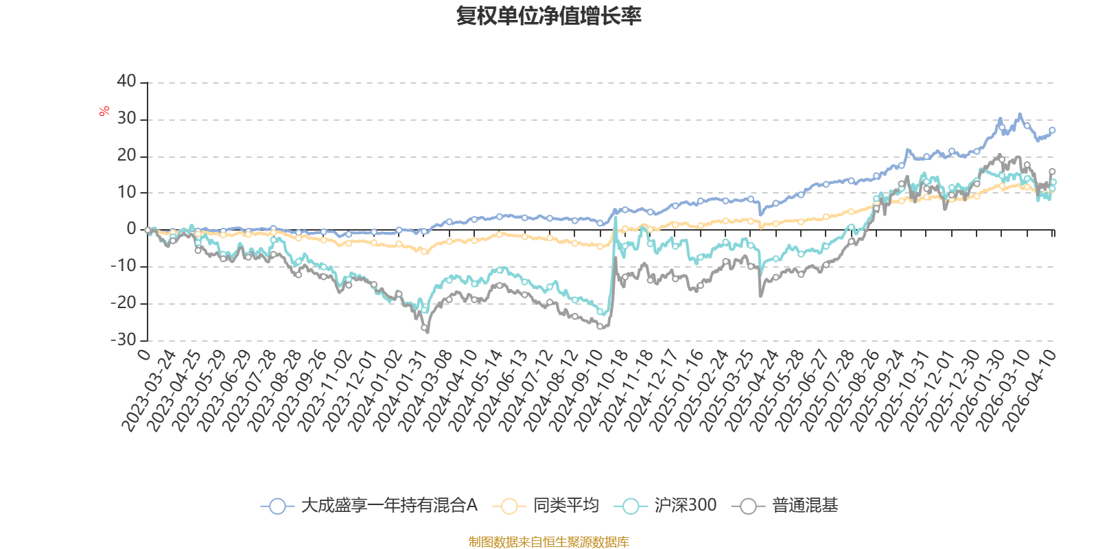 截至4月9日,大成盛享一年持有混合A近三个月复权单位净值增长率为3.50%,位于同类可比基金23/629;近半年复权单位净值增长率为4.09%,位于同类可比基金63/629;近一年复权单位净值增长率为21.48%,位于同类可比基金35/629;近三年复权单位净值增长率为27.24%,位于同类可比基金30/581。