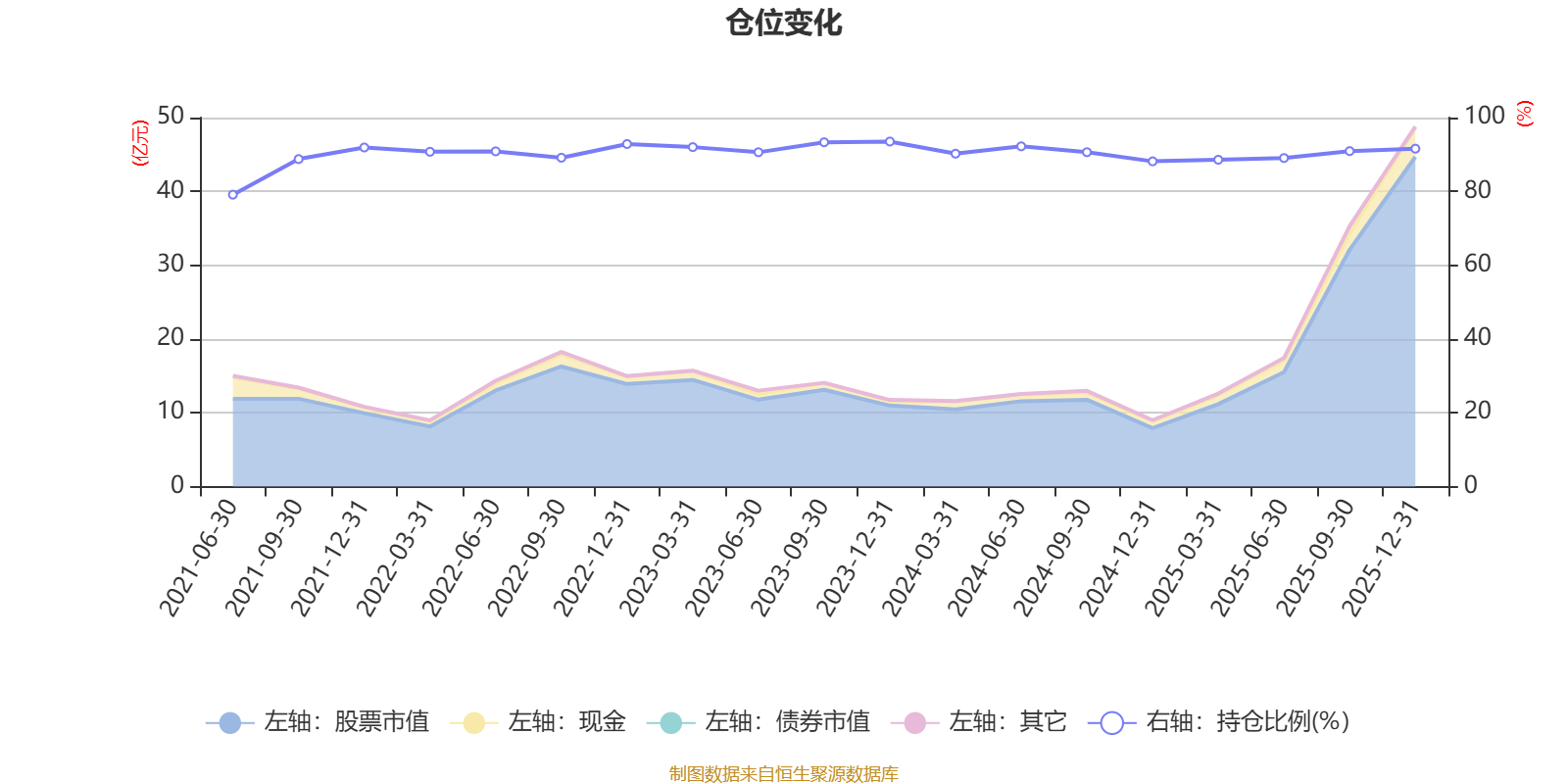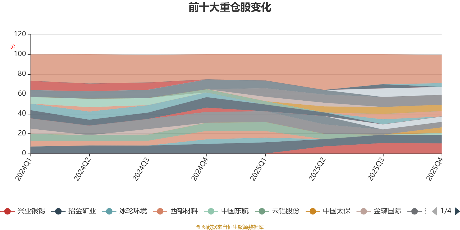 该基金持股集中度较高,近2年前十大重仓股集中度长期超过60%。截至2025年末,基金重仓股分别是兴业银锡、山东黄金、招金矿业、锡业股份、HTSC、中国太保、中金黄金、中曼石油、赛轮轮胎、中国东方航空股份、中国东航。