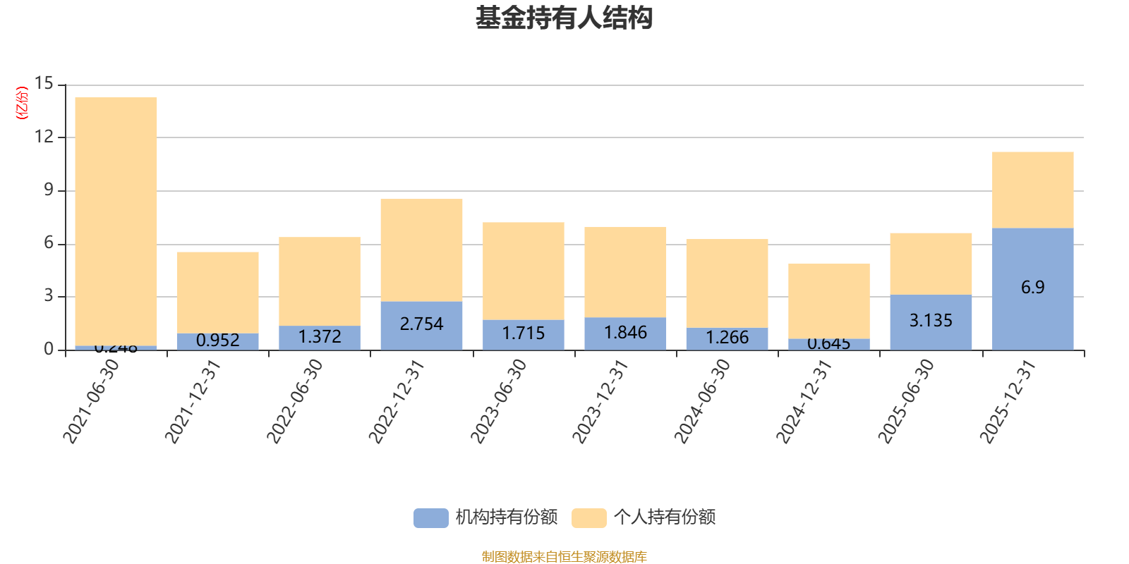 截至2025年12月31日,基金持有人共计3.25万户,合计持有11.19亿份。其中管理人员工持有727.13万份,占比0.65%,机构持有份额占比61.64%,个人投资者占比38.36%。