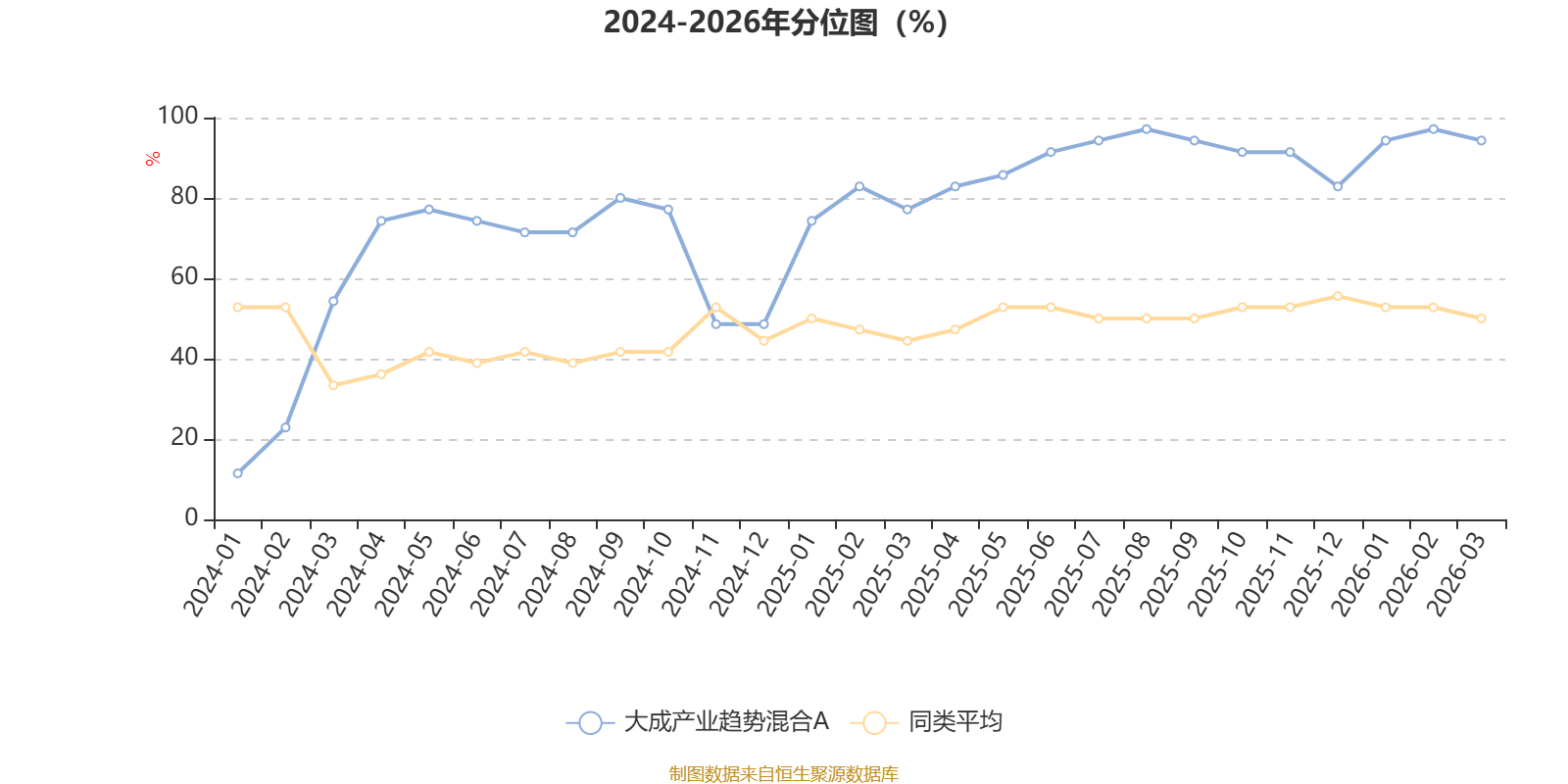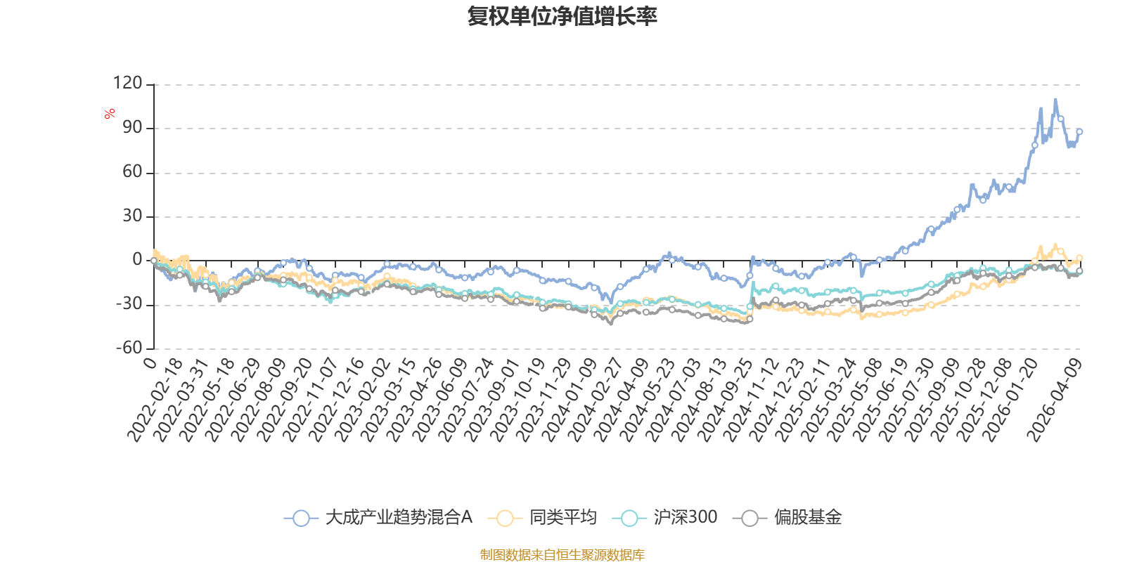 截至4月9日,大成产业趋势混合A近三个月复权单位净值增长率为13.26%,位于同类可比基金6/49;近半年复权单位净值增长率为23.33%,位于同类可比基金13/49;近一年复权单位净值增长率为104.64%,位于同类可比基金8/48;近三年复权单位净值增长率为99.17%,位于同类可比基金1/31。