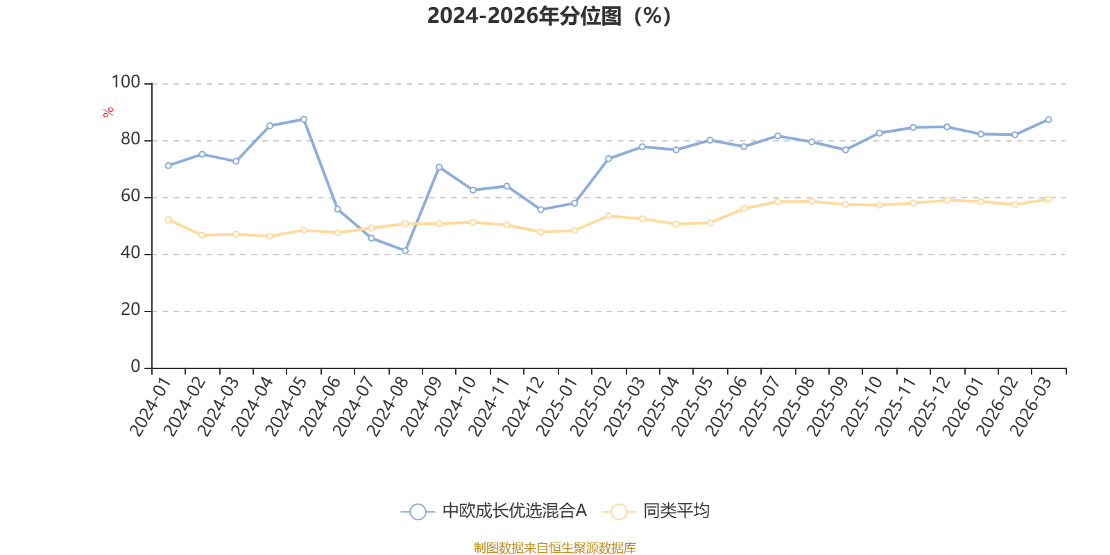 通过所选区间该基金净值增长率分位图,可以观察该基金与同类基金业绩比较情况。图为坐标原点到区间内某时点的净值增长率在同类基金中的分位数。