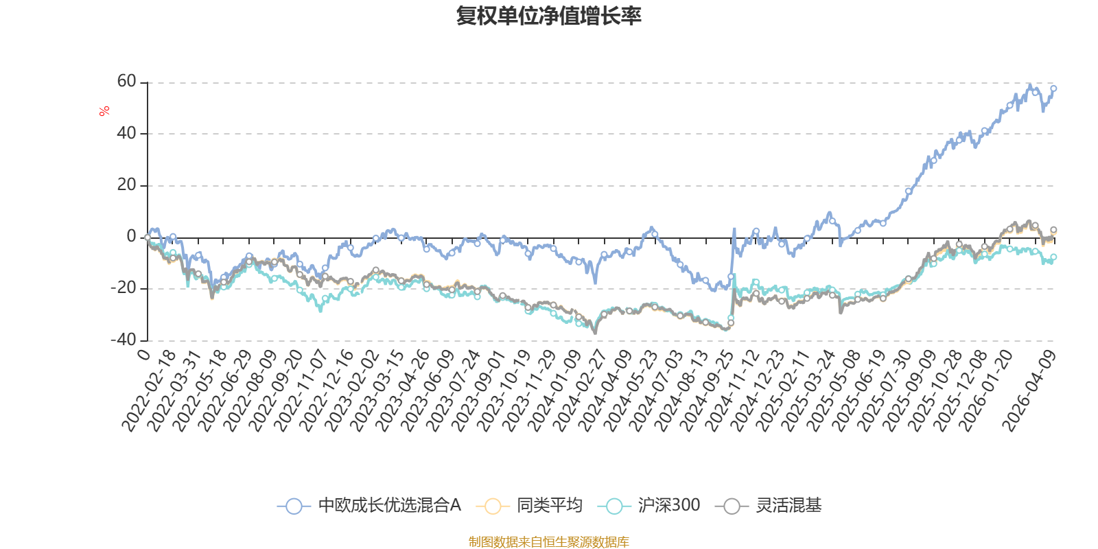 截至4月9日,中欧成长优选混合A近三个月复权单位净值增长率为5.76%,位于同类可比基金170/1287;近半年复权单位净值增长率为14.93%,位于同类可比基金125/1286;近一年复权单位净值增长率为60.74%,位于同类可比基金251/1286;近三年复权单位净值增长率为57.09%,位于同类可比基金112/1286。
