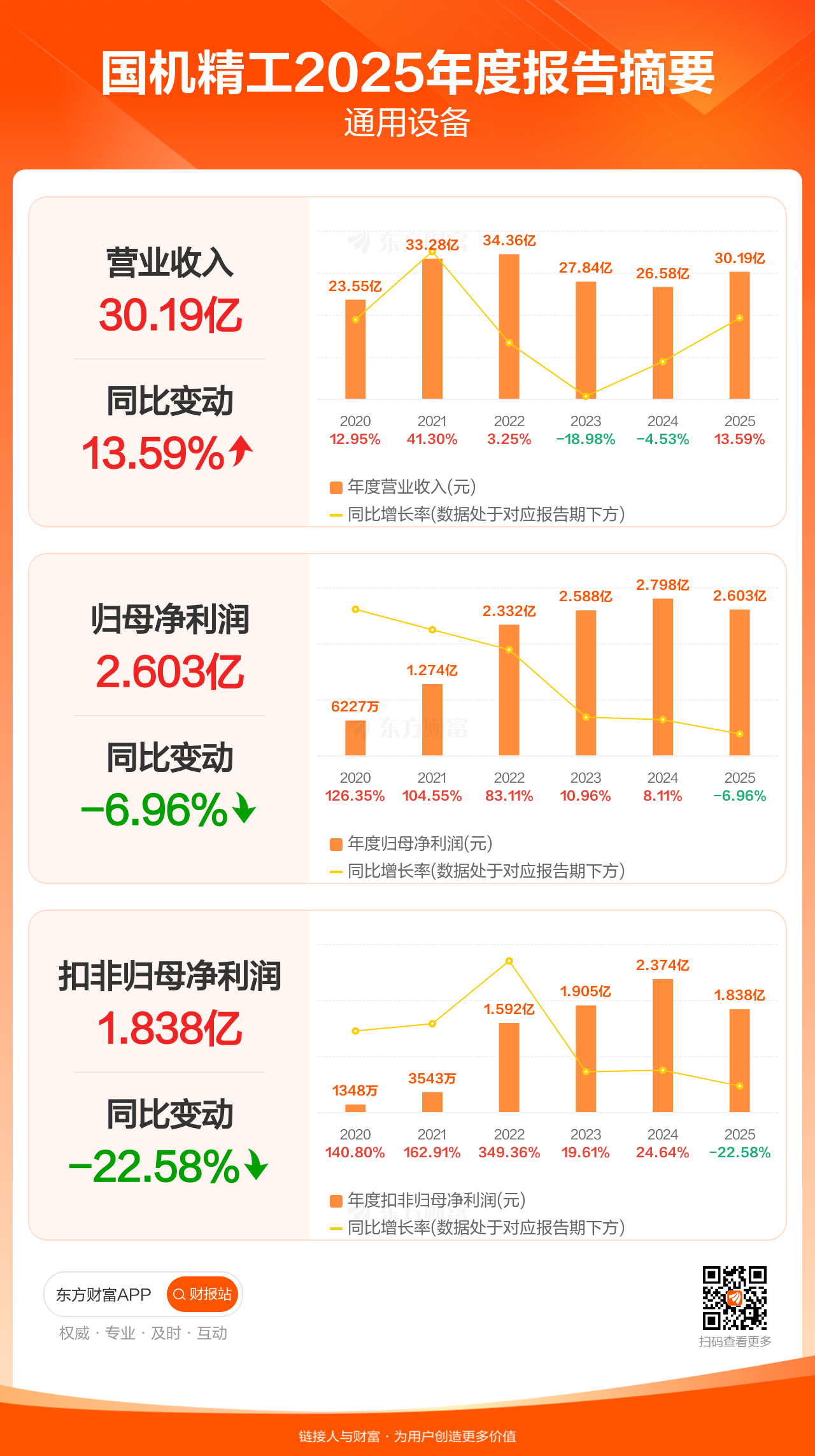 国机精工4月14日发布2025年年报显示,公司全年实现营业收入30.19亿元,同比增长13.59%;归母净利润2.60亿元,同比下滑6.96%;扣非归母净利润1.84亿元,同比下滑22.58%。