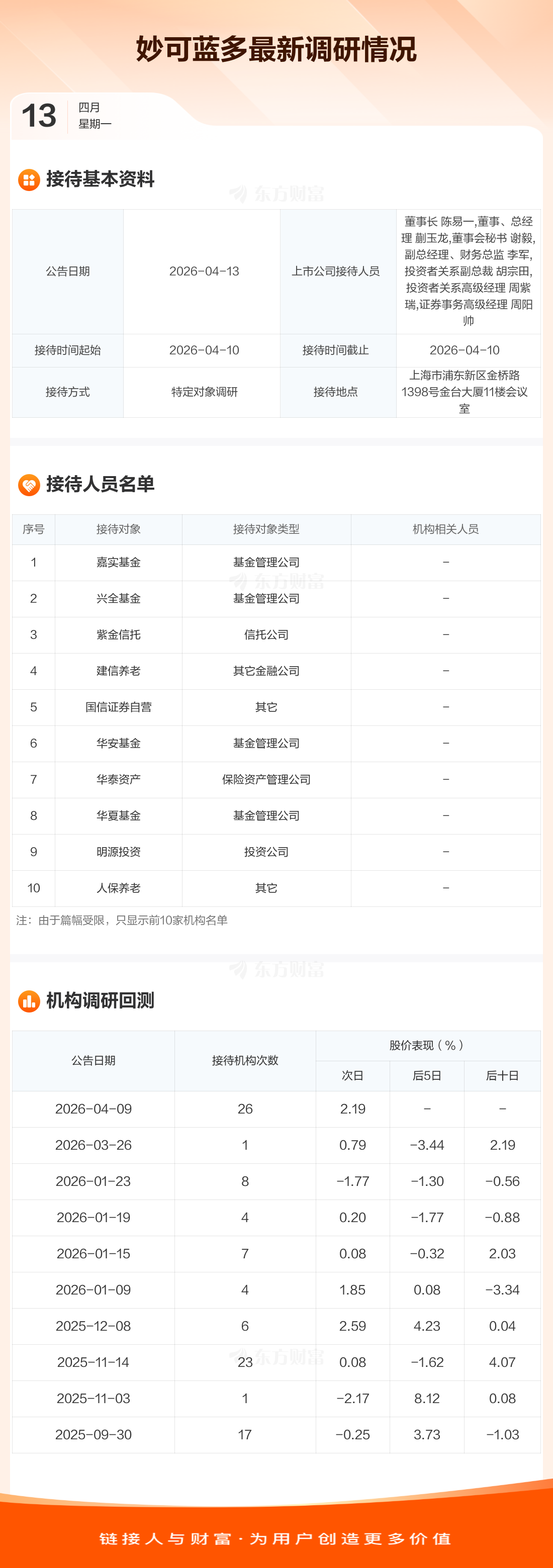 妙可蓝多4月13日公告称,4月10日接待嘉实基金等11家机构调研。接待人员包括董事长 陈易一,董事、总经理 蒯玉龙,董事会秘书 谢毅,副总经理、财务总监 李军,投资者关系副总裁 胡宗田,投资者关系高级经理 周紫瑞,证券事务高级经理 周阳帅。