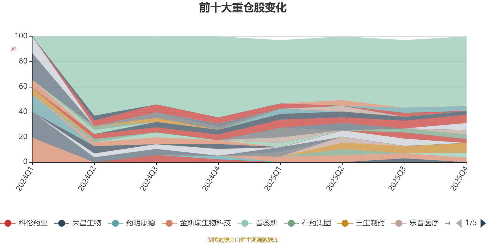 截至2025年末,基金十大重仓股分别是三生制药、科伦博泰生物-B、映恩生物-B、普蕊斯、百利天恒、康诺亚-B、金斯瑞生物科技、新诺威、先声药业、康方生物。