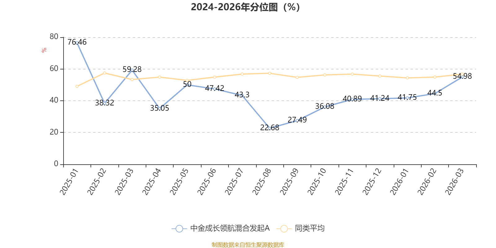 通过所选区间该基金净值增长率分位图,可以观察该基金与同类基金业绩比较情况。图为坐标原点到区间内某时点的净值增长率在同类基金中的分位数。