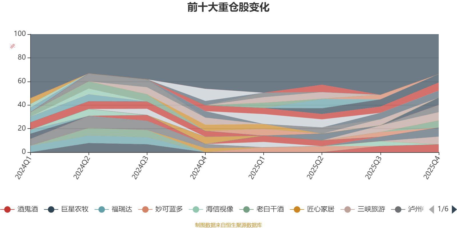 截至2025年末,基金十大重仓股分别是百龙创园、青木科技、若羽臣、科锐国际、三峡旅游、酒鬼酒、依依股份、古井贡酒、科拓生物、丸美生物。