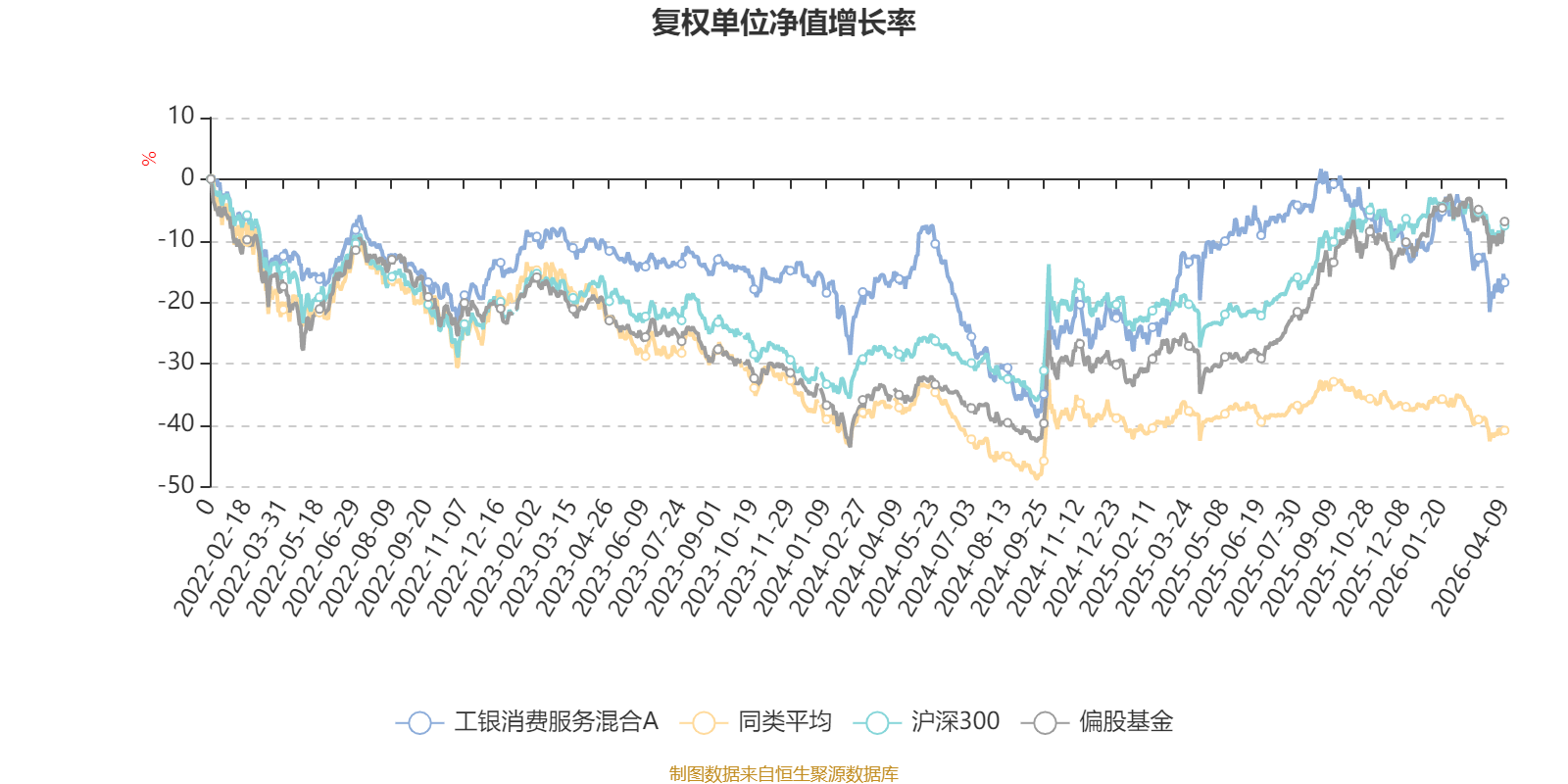 截至4月9日,工银消费服务混合A近三个月复权单位净值增长率为-9.25%,位于同类可比基金55/85;近半年复权单位净值增长率为-12.84%,位于同类可比基金51/85;近一年复权单位净值增长率为-3.08%,位于同类可比基金46/85;近三年复权单位净值增长率为-7.90%,位于同类可比基金13/76。