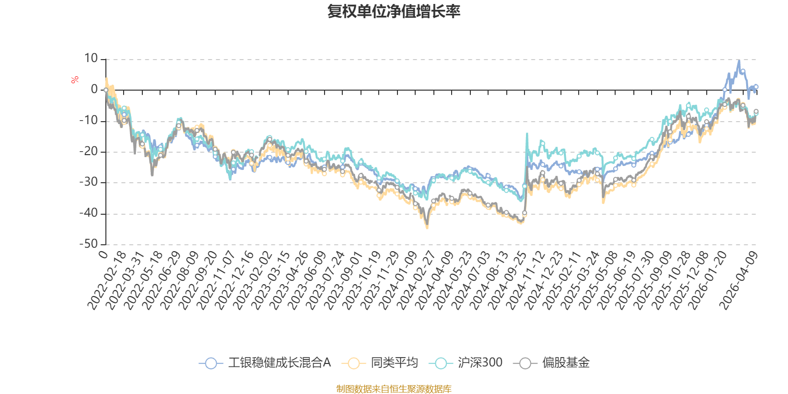 截至4月9日,工银稳健成长混合A近三个月复权单位净值增长率为4.27%,位于同类可比基金45/265;近半年复权单位净值增长率为16.63%,位于同类可比基金17/265;近一年复权单位净值增长率为40.87%,位于同类可比基金126/265;近三年复权单位净值增长率为29.76%,位于同类可比基金81/261。