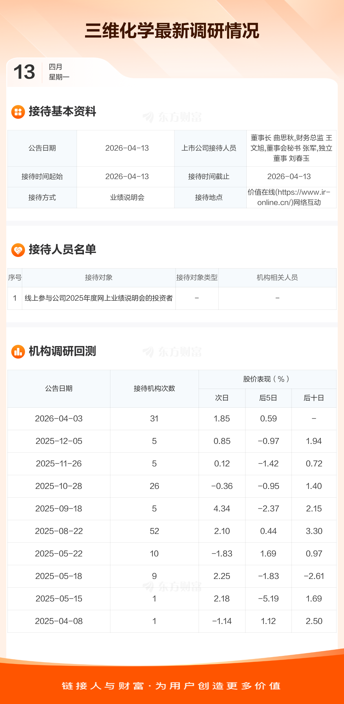 三维化学4月13日公告称,4月13日接待线上参与公司2025年度网上业绩说明会的投资者等1家机构调研。接待人员包括董事长 曲思秋,财务总监 王文旭,董事会秘书 张军,独立董事 刘春玉。