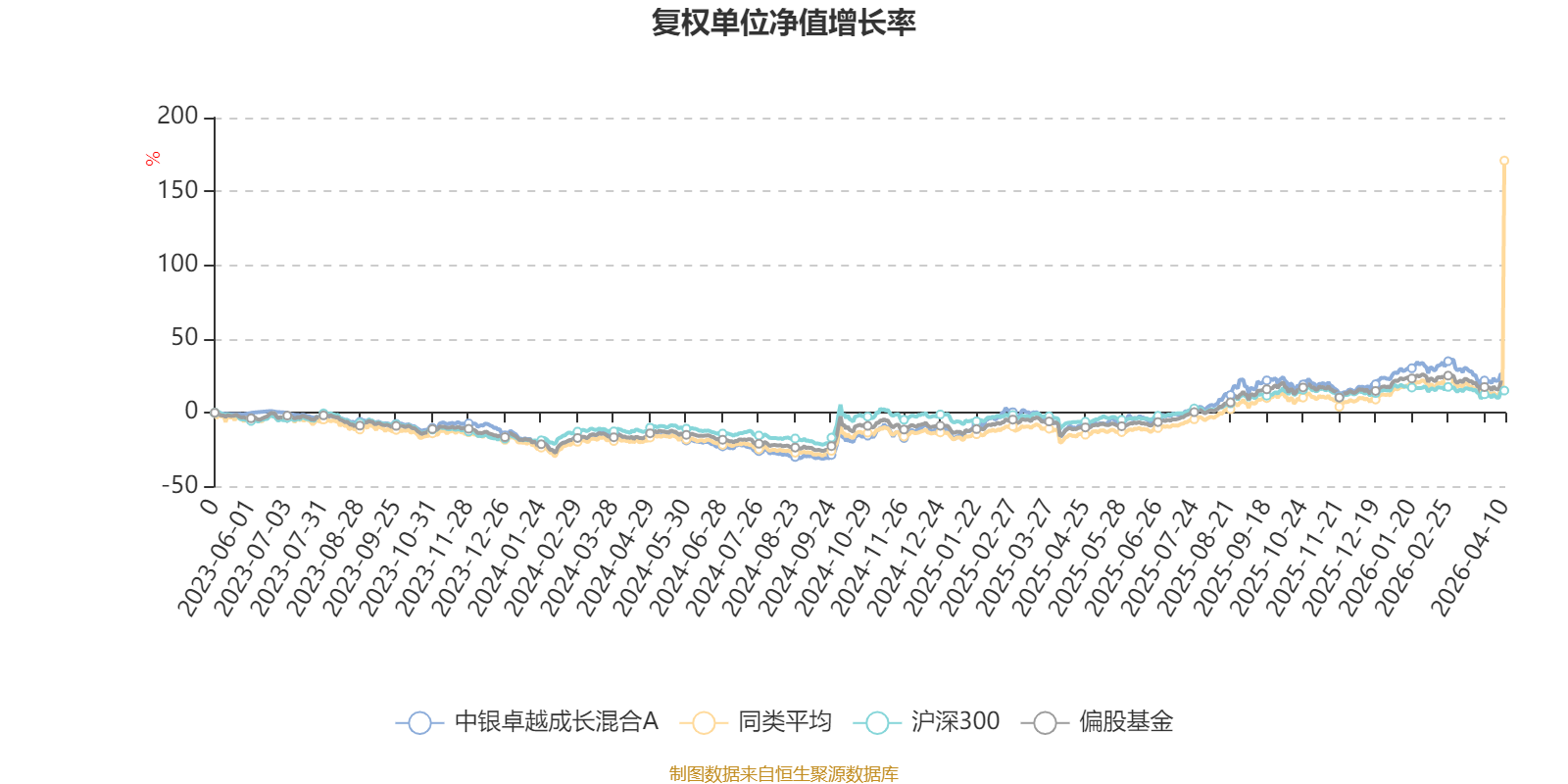 截至4月9日,中银卓越成长混合A近三个月复权单位净值增长率为-2.14%,位于同类可比基金354/621;近半年复权单位净值增长率为1.43%,位于同类可比基金297/621;近一年复权单位净值增长率为45.58%,位于同类可比基金235/618。