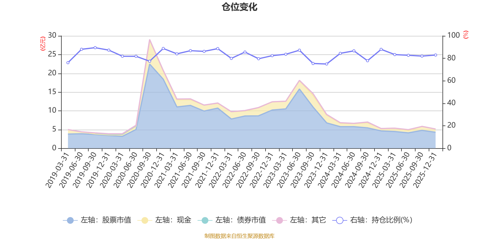 据定期报告数据统计,近三年平均股票仓位为82.44%,同类平均为72.57%。2019年三季度末基金达到89.48%的最高仓位,2023年末最低,为74.99%。