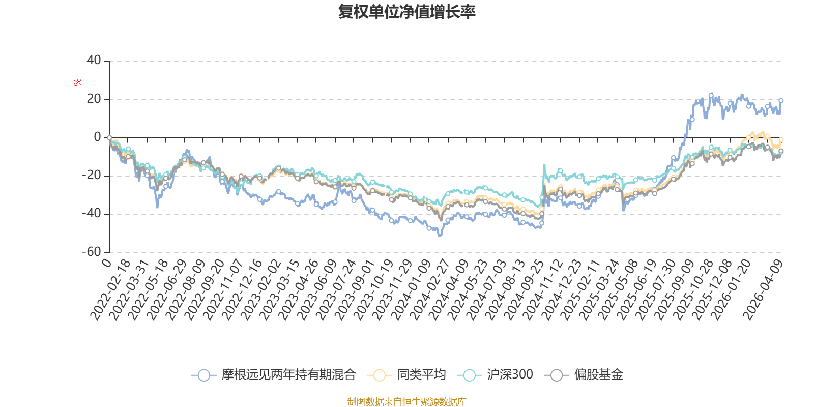 截至4月9日,摩根远见两年持有期混合近三个月复权单位净值增长率为-0.85%,位于同类可比基金62/130;近半年复权单位净值增长率为-0.99%,位于同类可比基金71/130;近一年复权单位净值增长率为90.84%,位于同类可比基金6/130;近三年复权单位净值增长率为69.06%,位于同类可比基金5/126。
