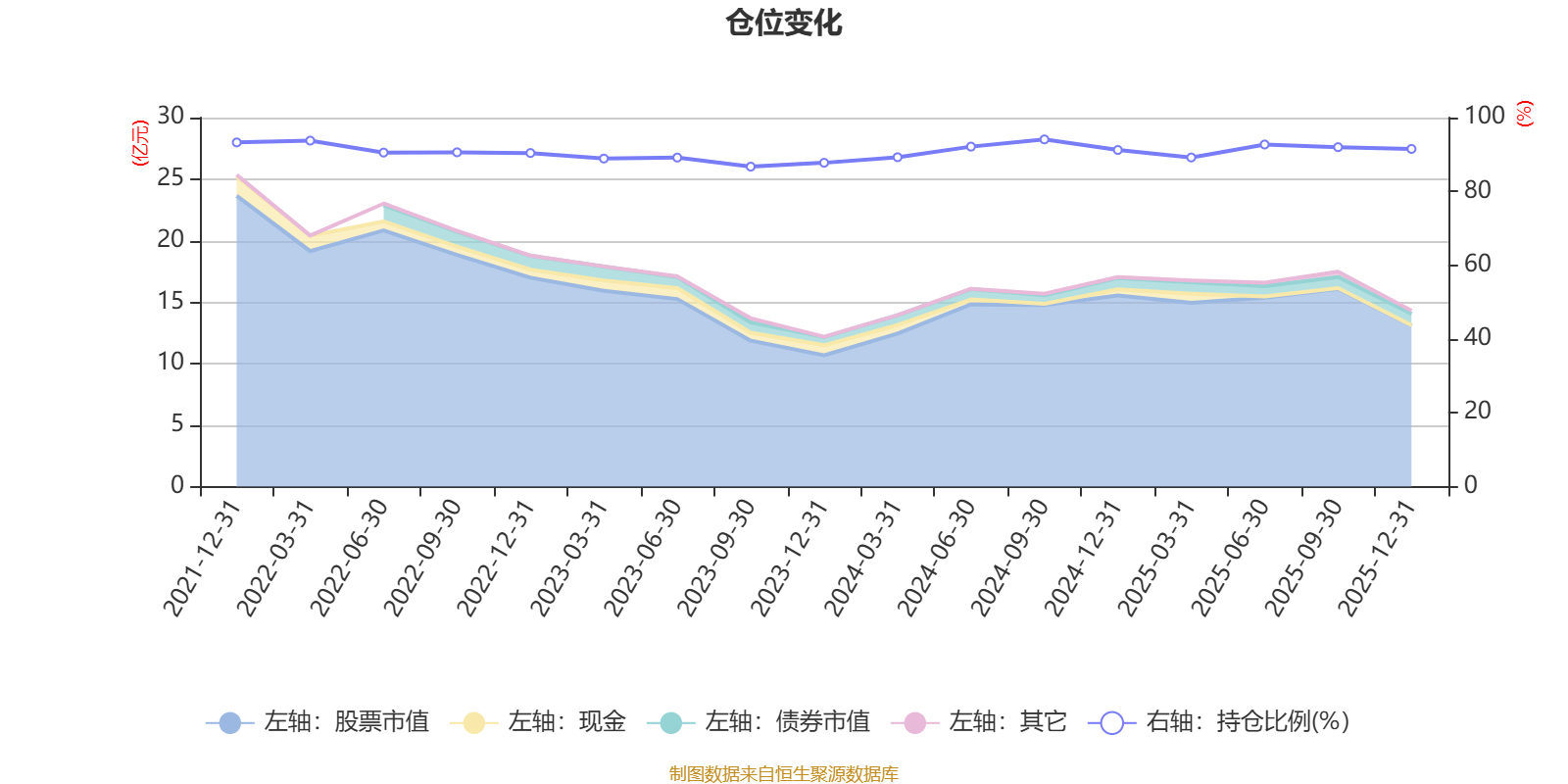 据定期报告数据统计,近三年平均股票仓位为90.39%,同类平均为87.64%。2024年三季度末基金达到94.09%的最高仓位,2023年三季度末最低,为86.7%。