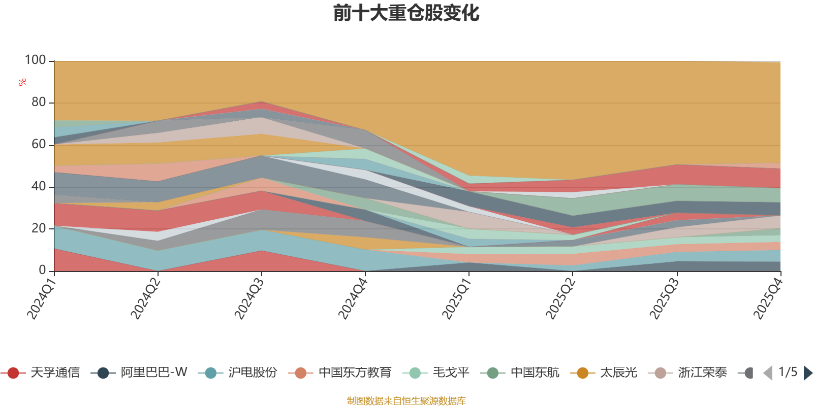 截至2025年末,基金十大重仓股分别是胜宏科技、泡泡玛特、腾讯控股、浙江荣泰、沪电股份、阿里巴巴-W、中国东方教育、中国东航、毛戈平、中国人寿。