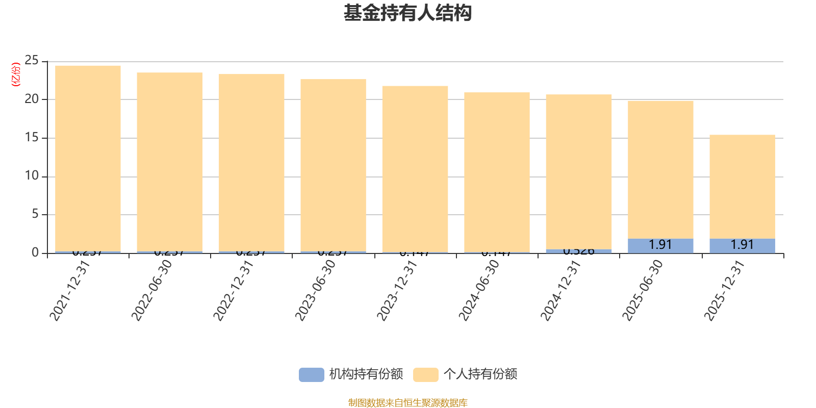 截至2025年12月31日,基金持有人共计1.3万户,合计持有15.42亿份。其中管理人员工持有20.47万份,占比0.01%,机构持有份额占比12.39%,个人投资者占比87.61%。
