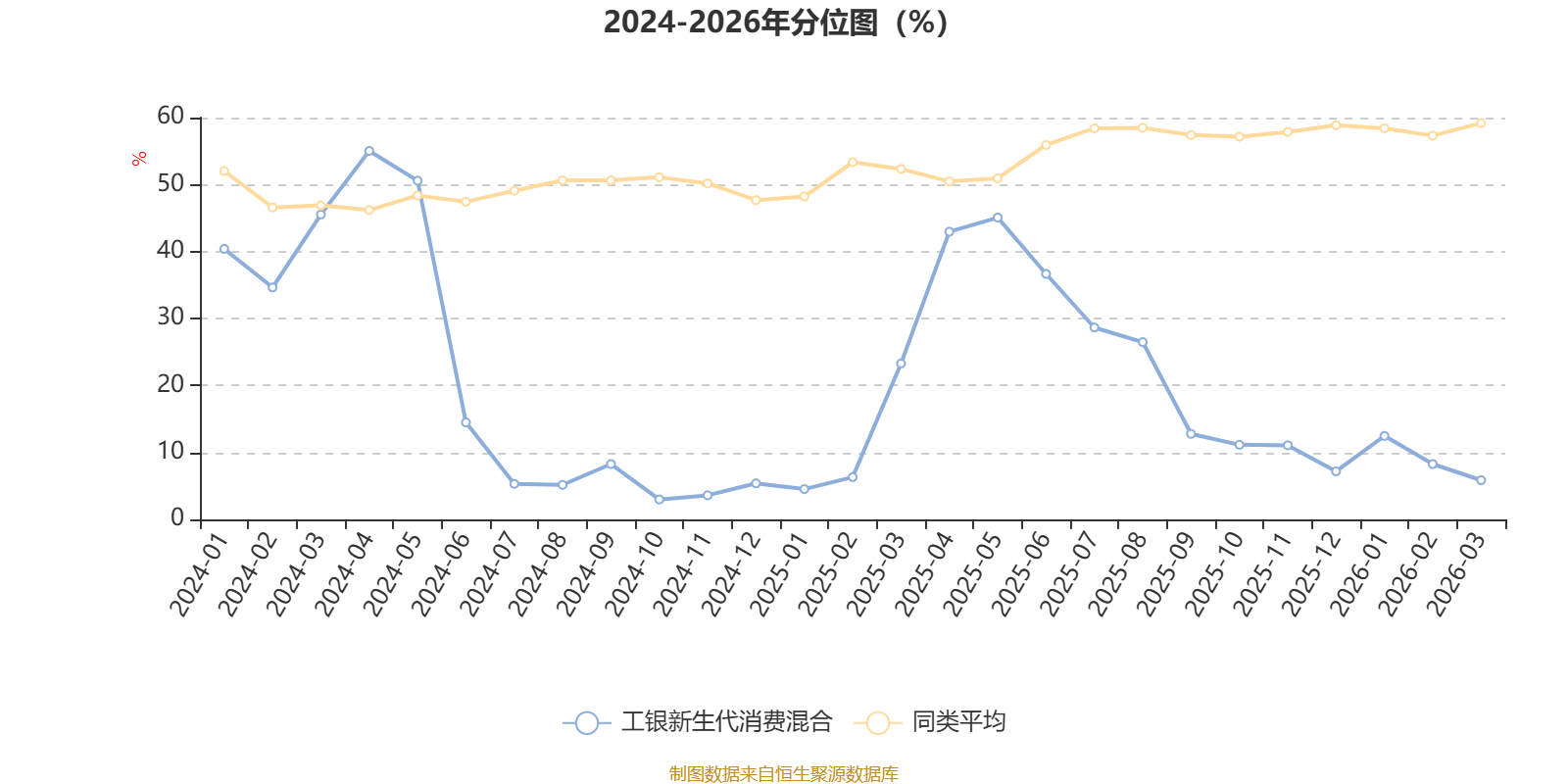 通过所选区间该基金净值增长率分位图,可以观察该基金与同类基金业绩比较情况。图为坐标原点到区间内某时点的净值增长率在同类基金中的分位数。