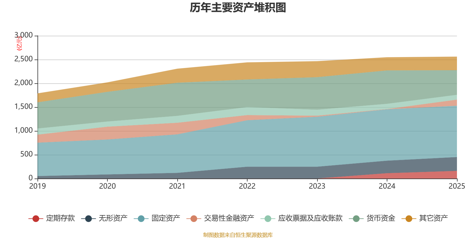 资产重大变化方面,截至2025年末,公司货币资金较上期末减少26.5%,占公司总资产比重下降7.42个百分点;交易性金融资产较上期末增加2433.24%,占公司总资产比重上升4.84个百分点;定期存款较上期末增加43.51%,占公司总资产比重上升1.87个百分点;无形资产较上期末增加10.62%,占公司总资产比重上升1.03个百分点。