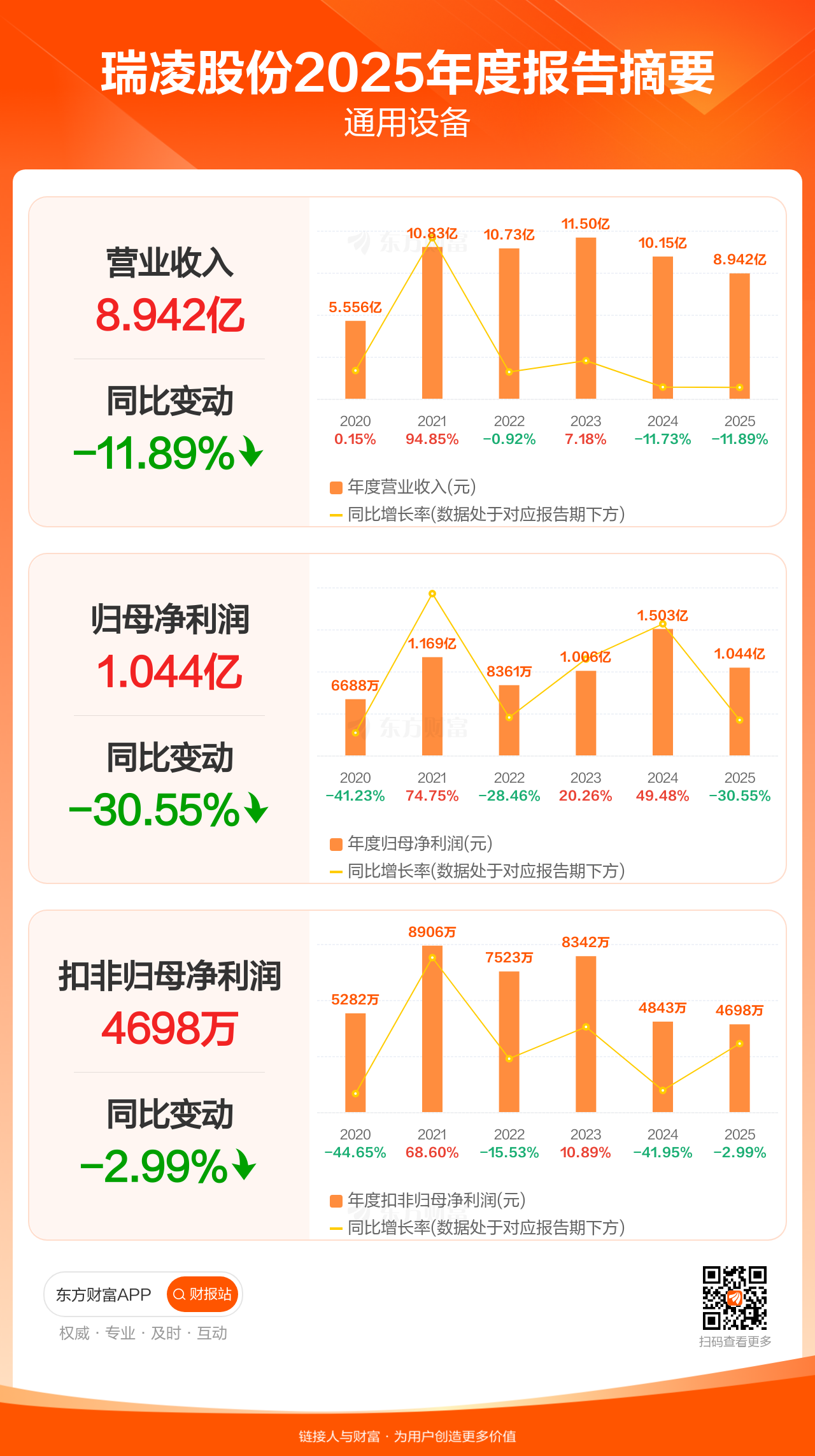 瑞凌股份4月14日发布2025年年报显示,公司全年实现营业收入8.94亿元,同比下滑11.89%;归母净利润1.04亿元,同比下滑30.55%;扣非归母净利润4698.25万元,同比下滑2.99%。