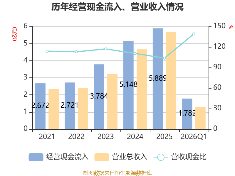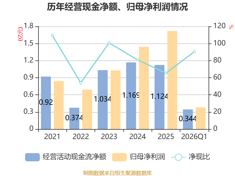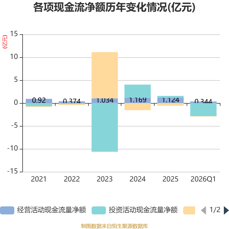 截至2026年一季度末,公司经营活动现金流净额为3441.8万元,同比增长91.07%;筹资活动现金流净额-671.01万元,同比减少656.36万元;投资活动现金流净额-2.86亿元,上年同期为-2.97亿元。
