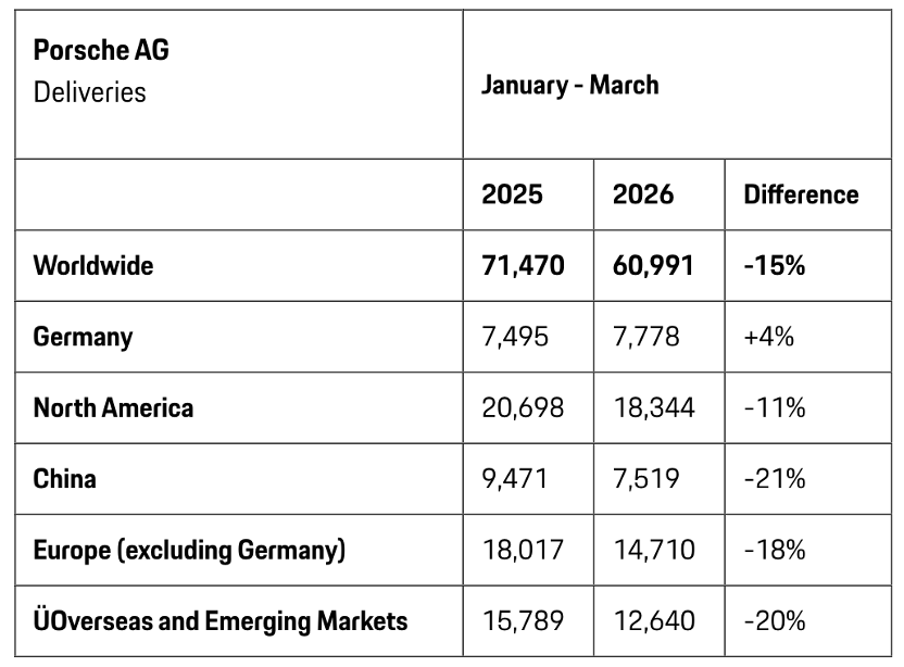 保时捷日前发布的交付报告显示,该公司2026年第一季度全球新车交付量为6.1万辆,较2025年同期的7.15万辆下降15%。保时捷表示,这一下滑态势符合公司此前预期,核心原因包括燃油版718车型停产、纯电Macan去年同期高基数效应以及美国电动车税收优惠政策取消等。