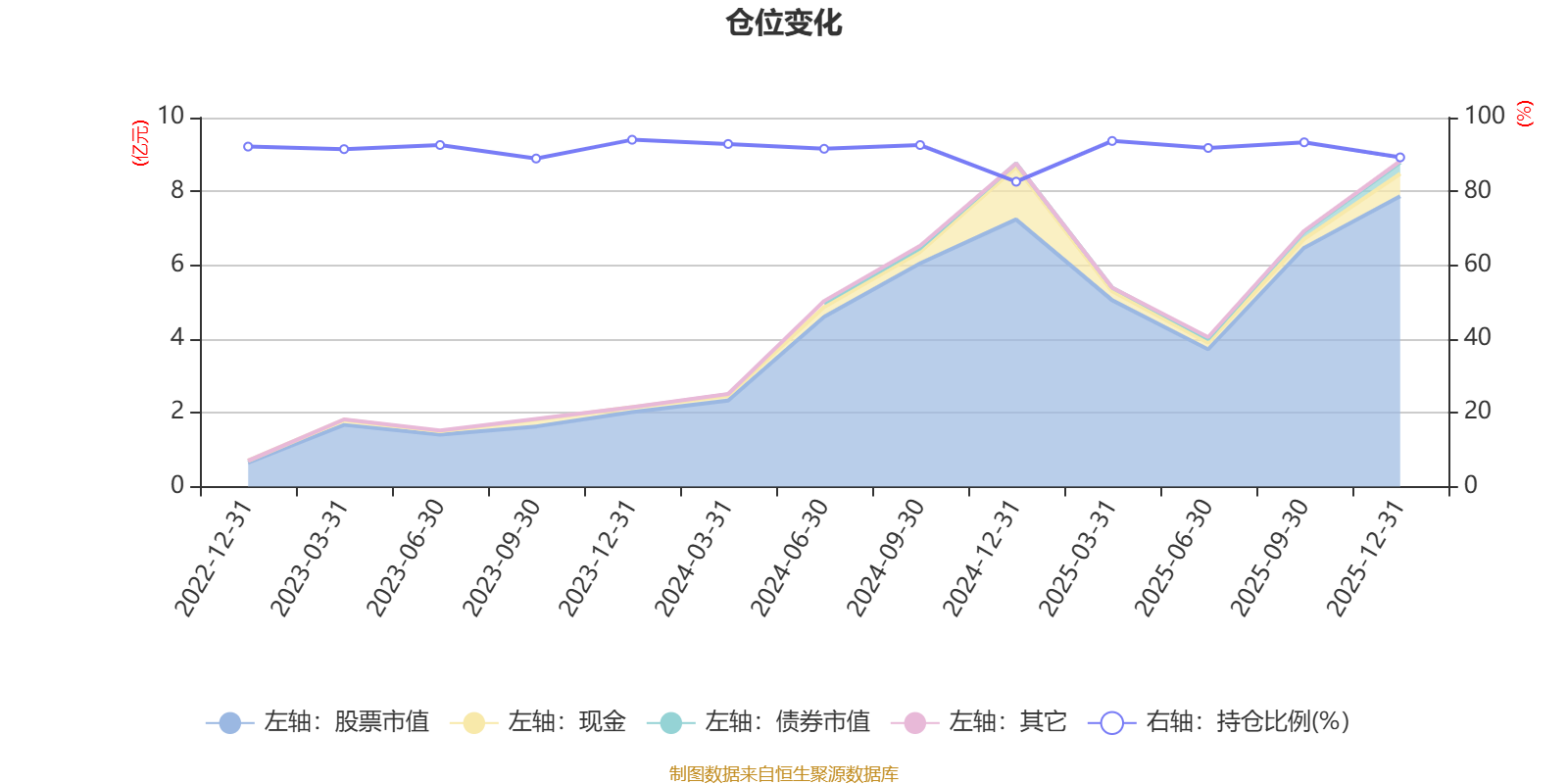 据定期报告数据统计,近三年平均股票仓位为91.21%,同类平均为85.83%。2023年末基金达到94%的最高仓位,2024年末最低,为82.63%。